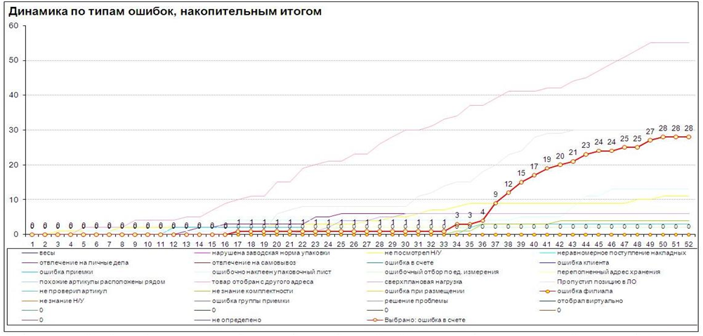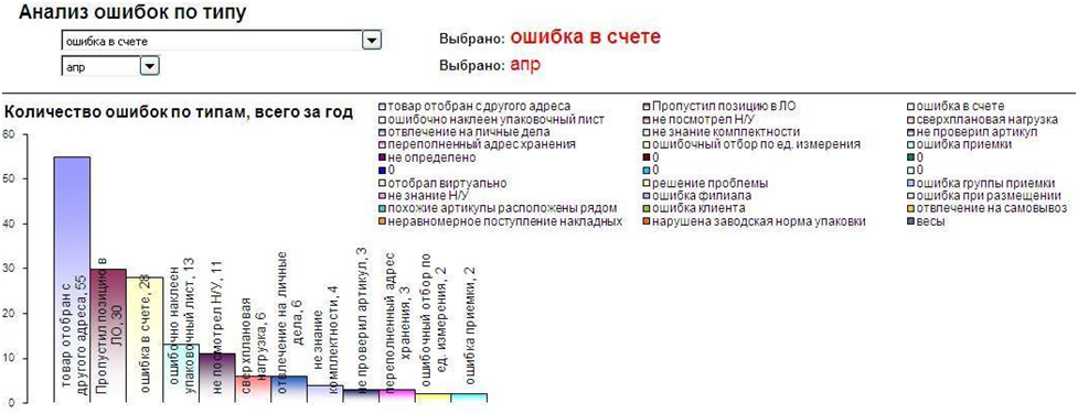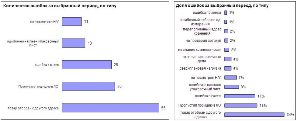 2.Следующие 2 графика показывают общею статистику ошибок, которые позволяет выявить самую распространенную ошибку соответственно являющаяся приоритетной в рассмотрении причин возникновения на примере показана ошибка «товар отобран с другого адреса».