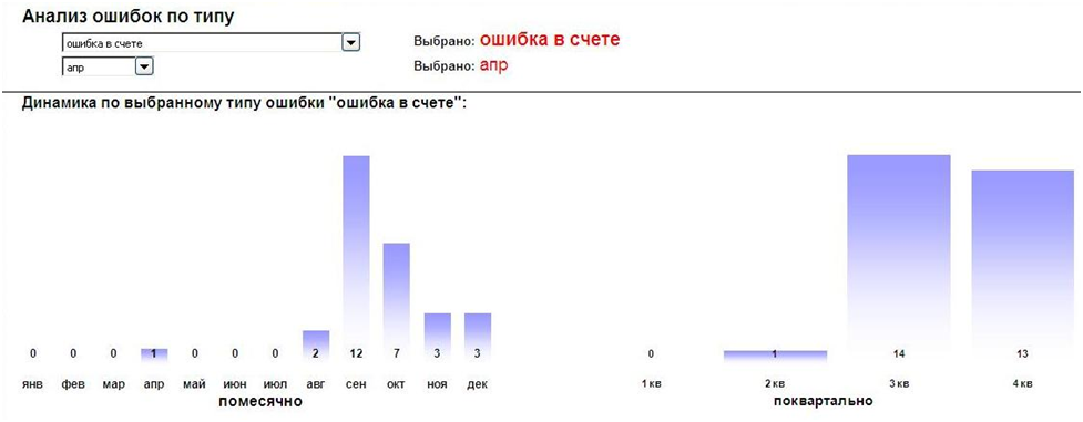 1.Следующий анализ показывает общею динамику помесячно и поквартально, так же имеется по недельная динамика по выбранной ошибке «ошибка в счете» из которого видно, что данная ошибка преобладает в конце 3 квартала и весь 4 — й квартал, как вывод данная ошибка возникает во время повышенной интенсивности работы.