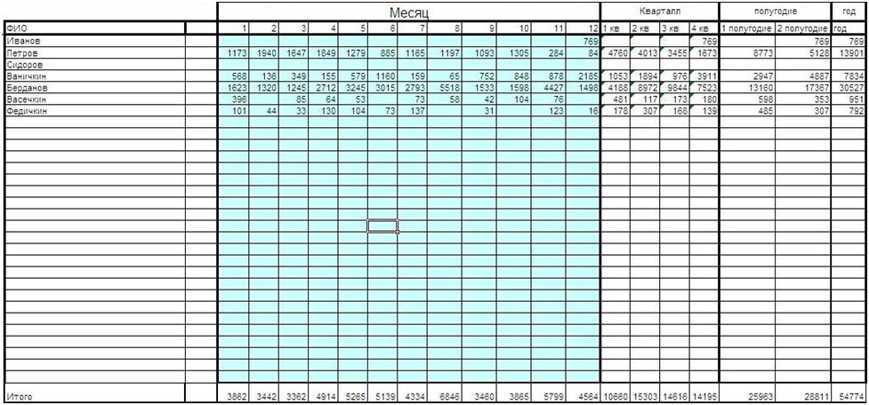 - Итоги, отчет формируется с помощью инструмента «Сводная таблица».