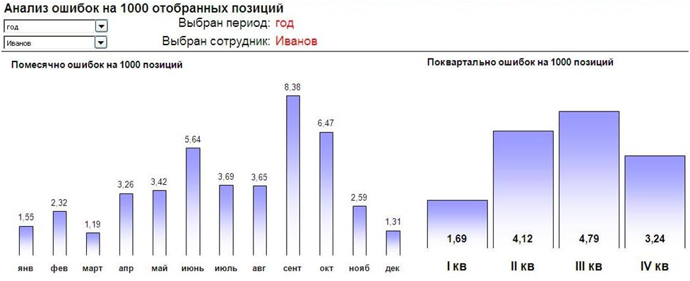 1.Анализ количества ошибок на 1000 отобранных позиций допущенных всеми комплектовщиками в разрезе помесячно, поквартально